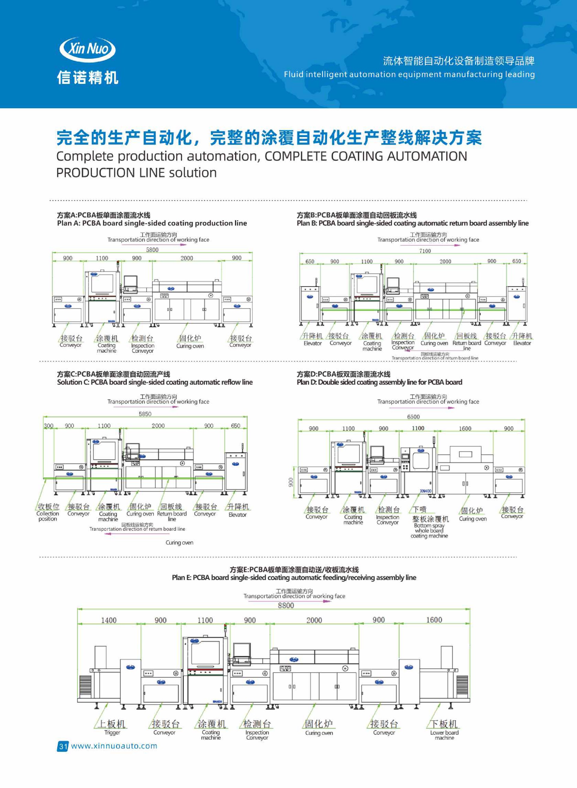 信诺专注于流体智能控制设备的研发与制造;全自动点胶机、三防漆选择性涂覆机(在线式/离线式)、三防漆整版(盲喷)涂覆机、涂覆AOI检测设备、灌胶机、在线式固化炉(UV/红外/热风)、SMT周边配套设备、各类TP拆屏设备等; 设备主要用于高端制造业中的涂层覆盖、点胶密封、粘接固定